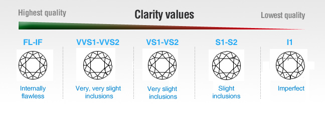 Inclusions found in white diamonds have the greatest affect on the value of a diamond’s clarity grading. This is not as important when considering colored diamonds unless they’re directly affecting the look or sparkle of the diamond. The clarity of a diamond should always be determined when the diamond is loose because a jewelry setting may hide inclusions in the stone. A diamond’s clarity is measured on a scale ranging from pure (flawless) to heavily included (I-3) by viewing the diamond at ten times magnification. What we would be looking for are any internal or external blemishes that retract from the value of the stone.
